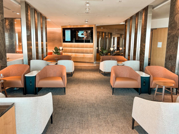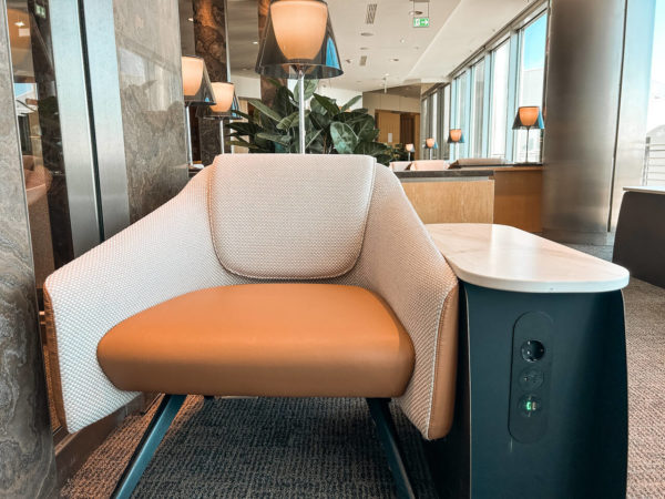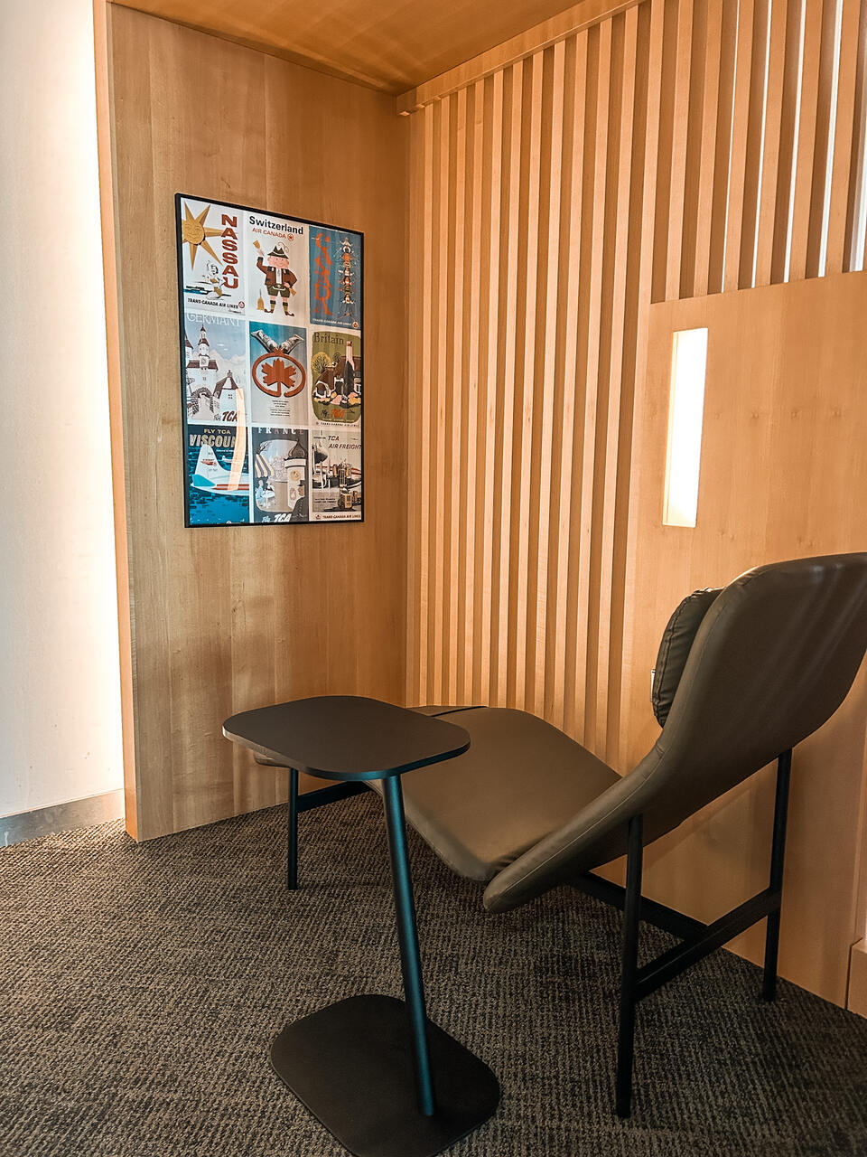 In the rear of the lounge, semi-private relaxation areas with reclining seats are perfect for a short power nap or a quiet break before boarding.