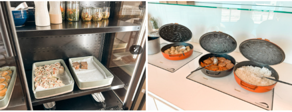 A new addition includes a large refrigerator stocked with freshly wrapped wraps, salads, and cold snacks, replacing the previous circular salad buffet.