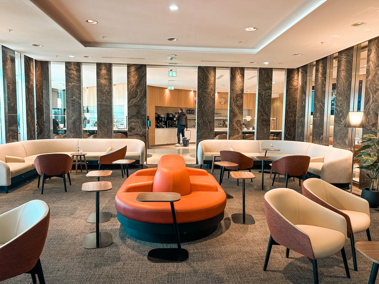 In the centre of the lounge, a previously red-orange sculpture has been removed to create additional seating. While a striking design element was lost, the space now feels more open and flexible.