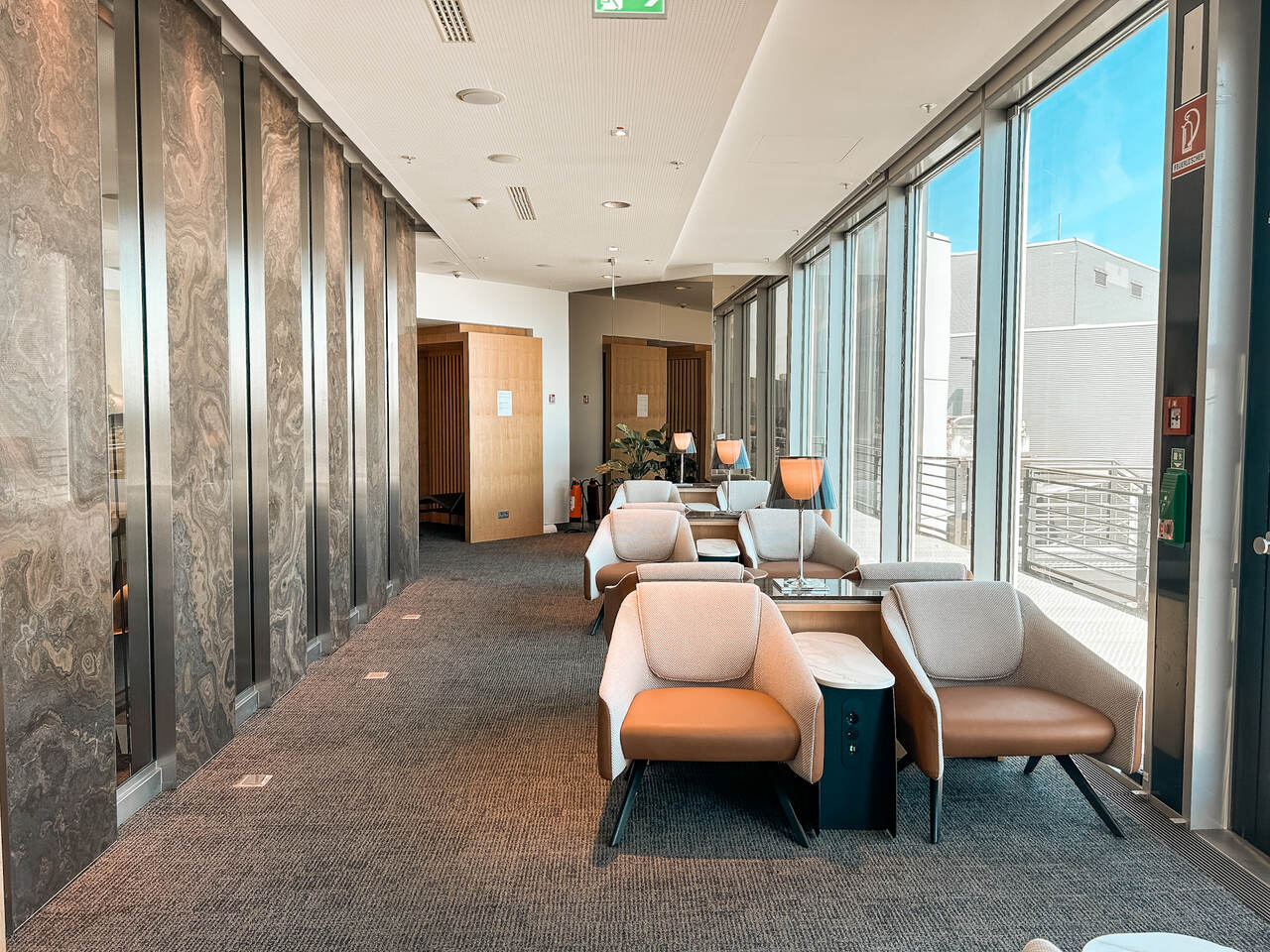 A highlight of the lounge is the view of the apron, where guests can watch planes from around the globe take off and land while enjoying a drink – a treat for aviation enthusiasts and those seeking relaxation alike.